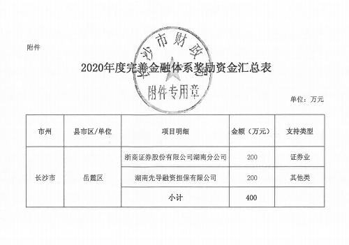 上月底,湖南省地方金融监督管理局、湖南省财政厅官网公示2020年度省级金融发展专项资金奖励名单,拟对担保公司给予200万元奖励。7月24日,长沙市财政局下发《关于拨付2020年省级完善金融体系奖励政策资金的通知》(长财金指〔2020〕4号),担保公司喜获200万元专项资金奖励。