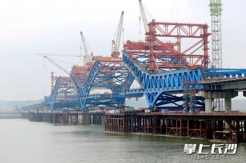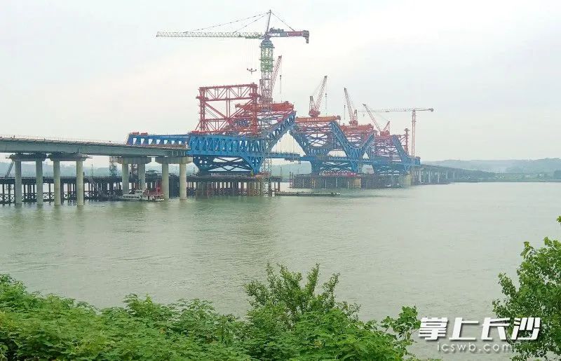 端午小长假期间,暮坪湘江特大桥建设工地施工忙。暮坪湘江特大桥桥梁全长3.928公里,预计今年10月合龙。